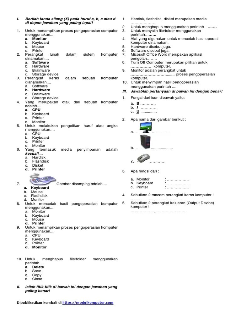 Soal ini dibuat berdasarkan materi yang terdapat pada modul komputer kelas 1 sd, bagi yang belum mendapatkan modul komputer kelas 1 sd tersebut silahkan langsung melihatnya pada toko kami.